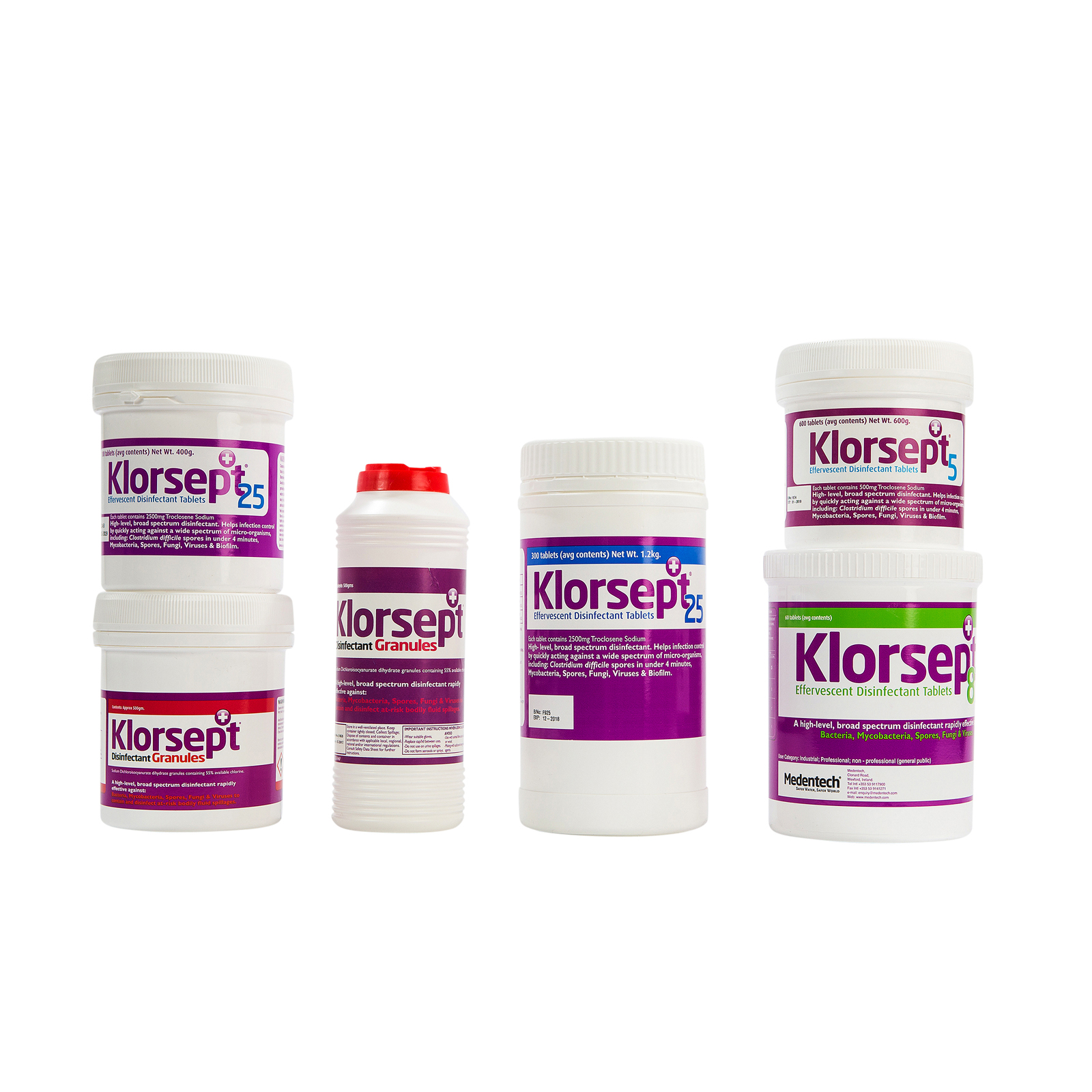 Klorsept is used to disinfect high, intermediate and low level environmental surfaces in clinical settings. It is specially formulated to give exact and easy-to-prepare disinfecting solutions, with broad spectrum activity against micro-organisms including: